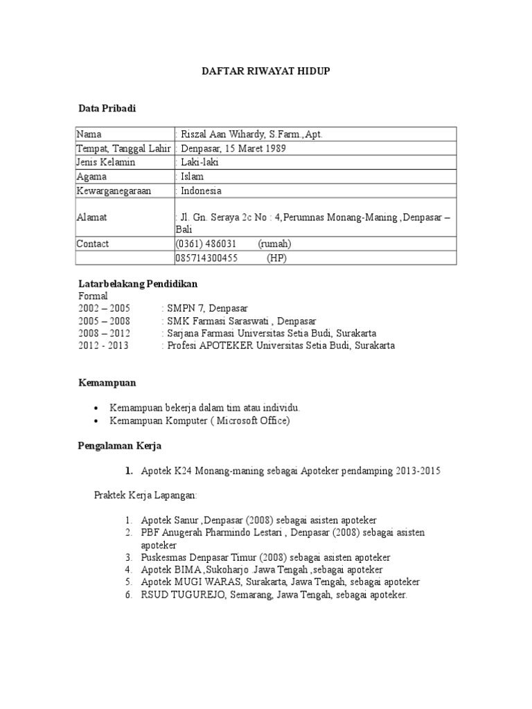 Contoh daftar riwayat hidup asisten apoteker. We did not find results for: Check spelling or type a new query. Maybe you would like to learn more about one of these?